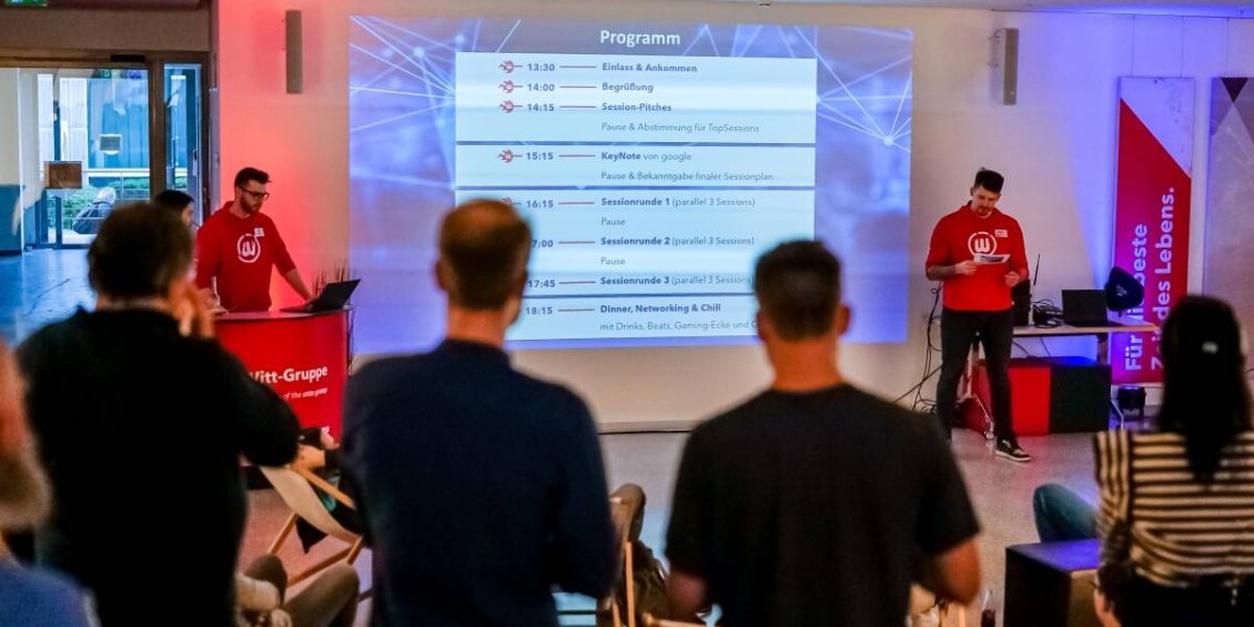 13:30 Uhr: Startschuss für das mittlerweile siebte DevCamp der Witt-Gruppe. Nach einem kurzen Check-In der Teilnehmer*innen ging das offizielle Programm des Tages auch schon los. Wie bereits in den Jahren zuvor, war das Event erneut an das sogenannte Bar Camp Format angelehnt. Alle Teilnehmer*innen hatten in der Open Space Atmosphäre die Möglichkeit ein Thema zu pitchen, über welches sie gerne referieren möchten. Das Publikum legte dann anhand eines Votings die Agenda des Tages fest.