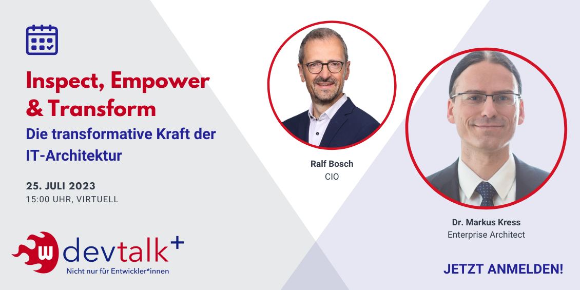 Unter dem Thema "Inspect, Empower & Transform: Die transformative Kraft der IT-Architektur" fanden sich über 75 (über-)regionale Teilnehmer*innen zusammen, um an unserem virtuellen Tech-Event teilzunehmen. Nach der Keynote von unseren Inhouse-Experten Dr. Markus Kress (Enterprise Architect) und Ralf Bosch (CIO) folgte eine spannende Q&A-Session samt Diskussionsrunde, die die Vielseitigkeit und Relevanz des Themas IT-Architektur unterstrich.