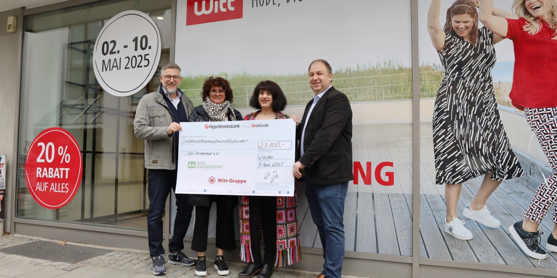 Von Oktober bis Dezember 2024 ging pro verkauften Set aus Kuscheldecke und Eisbär „Tony“ 1€ direkt an unseren langjährigen Kooperationspartner SOS-Kinderdorf – speziell für das Projekt „Ambulante Hilfen“ in der Oberpfalz. Dieses Projekt bietet ambulante flexible Hilfen, um Kinder und ihre Eltern individuell zu unterstützen, damit die Mädchen und Jungen in ihren Herkunftsfamilien bleiben können. Das Team hilft, kindgerechte Lebensbedingungen zu schaffen und das Zusammenleben zu verbessern. Die letzte Aktion markiert bereits das 20. Jahr unserer Weihnachtsaktion in Kooperation mit SOS-Kinderdorf – wie man sieht ein echtes Herzensprojekt für uns! Bei einem kleinen Baustellen-Rundgang durch unseren neuen Witt Flagship-Store, der am 2. Mai in Weiden eröffnet, übergab Filial-Bereichsleiter Werner Bodensteiner den Scheck an SOS-Kinderdorf Oberpfalz.