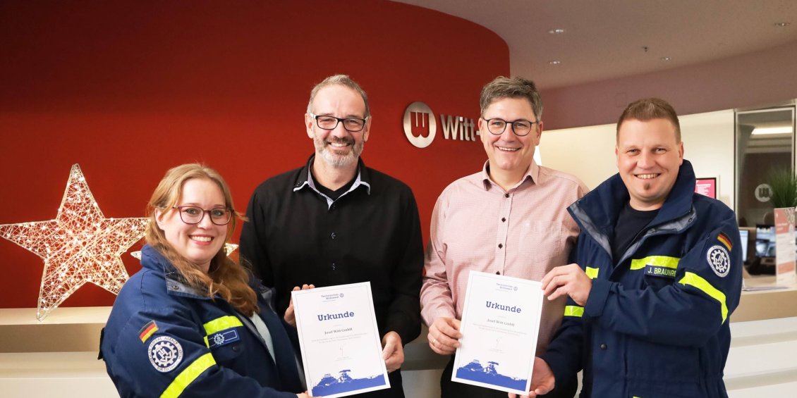 Als Teil des Zugtrupps im Einsatzgebiet Regensburg unterstützten Lena und Jan die betroffenen Regionen. Wir als Witt-Gruppe sind unglaublich stolz, so engagierte Mitarbeitende in unseren Reihen zu haben. Die Unterstützung von Ehrenämtern ist uns ein wichtiges Anliegen, denn wir wissen, wie entscheidend solidarische Hilfe in Krisenzeiten ist. Deshalb wurden Lena und Jan von ihren Abteilungsleitern Stefan Burkhardt und Reinhard Kick für die Zeit ihres Einsatzes freigestellt. Als Anerkennung für diese Unterstützung überreichte das THW eine Dankesurkunde an die Witt-Gruppe, stellvertretend an Lena und Jan. Jan findet es schön, "dass die Freistellung durch das Unternehmen immer sehr unkompliziert abläuft und unser Team uns bei unserem Engagement unterstützt."